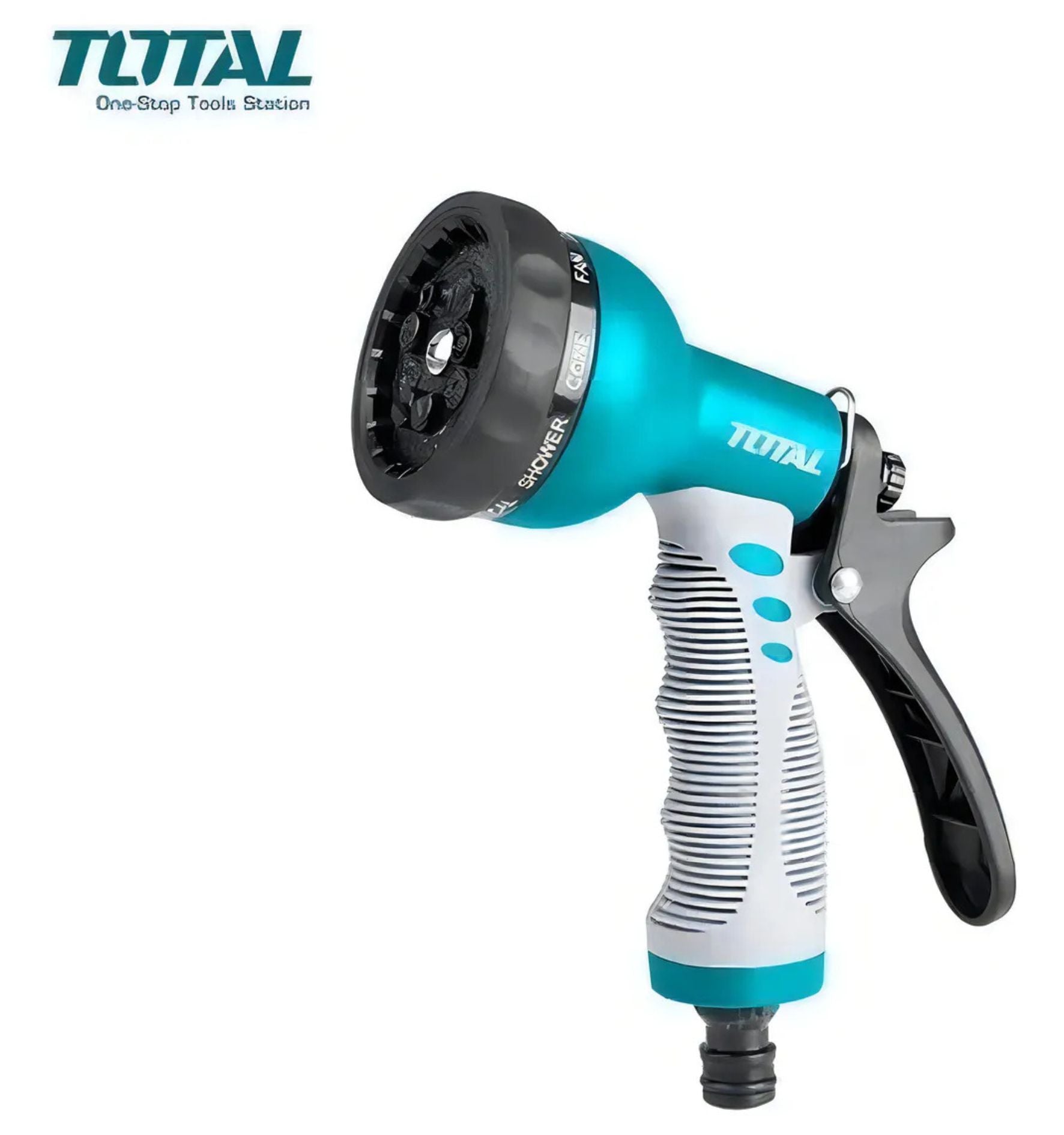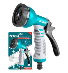 La pistola de riego para jardín Total de 9 posiciones es una herramienta versátil y resistente, diseñada para adaptarse a todo tipo de tareas de riego y limpieza exterior.