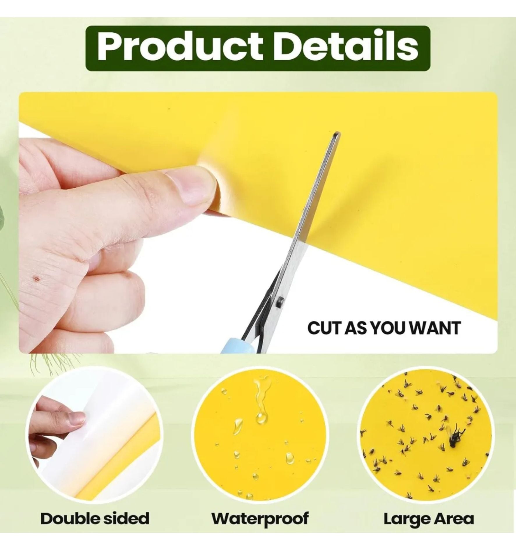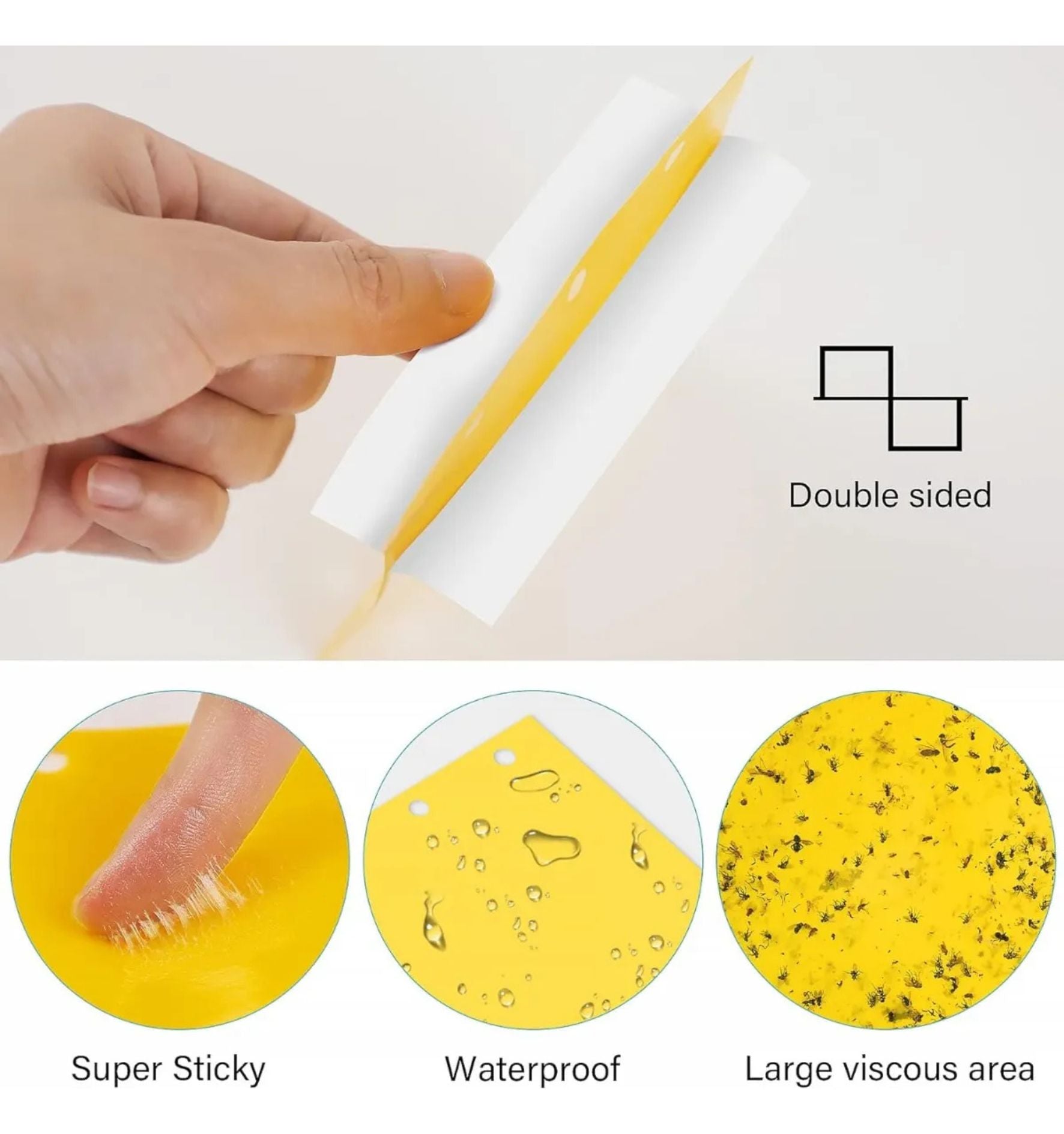 Su color amarillo brillante atrae naturalmente a los insectos, mientras el pegamento de doble cara los captura de forma rápida y limpia, sin necesidad de químicos.